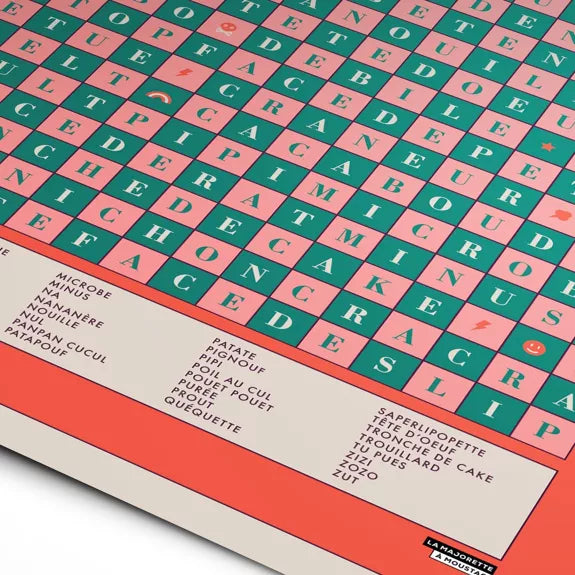 DES MOTS MÊLÉS LUDIQUES POUR LES ENFANTS : Décalée et drôle, cette affiche répertorie les gros mots enfantins de la cour de récré de tronche de cake à face de slip.