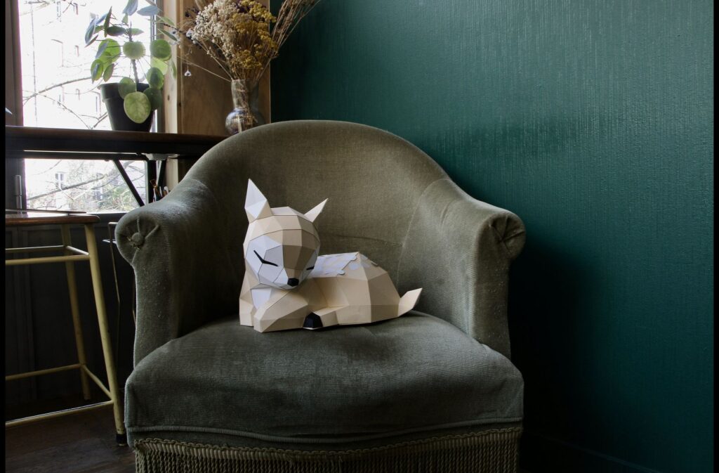 Ce faon en papier à monter soi-même peut se poser sur n’importe quel meuble de votre maison, tout lui ira à merveille, que ce soit une commode, un buffet, une litière pour chat, une bibliothèque… Et si vous souhaitez lui ajouter une touche de papier, pensez à l’assortir à notre rocher en papier !